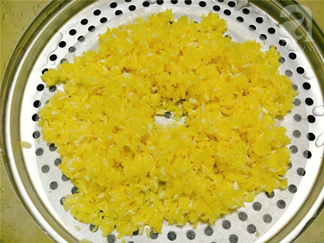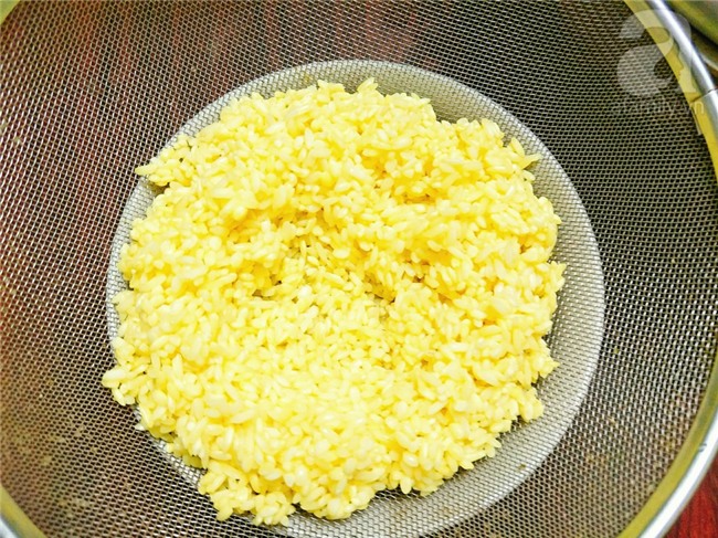 Gạo nếp vo sạch rồi cho vào tô, đổ nước ngập gạo rồi thêm bột nghệ trộn đều, ngâm gạo qua đêm cho mềm.