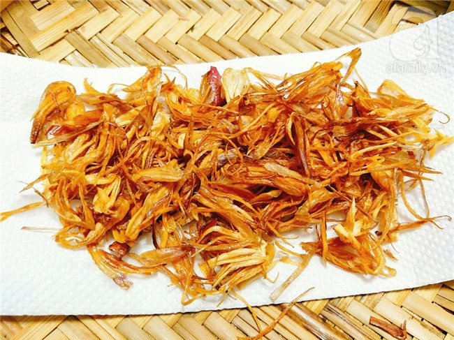 Hành khô bóc vỏ rồi thái lát thật mỏng, cho mỡ lợn hoặc dầu ăn vào nồi đun cho dầu nóng sau đó cho hành khô vào phi ở lửa nhỏ vừa, hành chuyển màu vàng giòn là vớt ra ngay, để hành phi trên giấy thấm dầu.