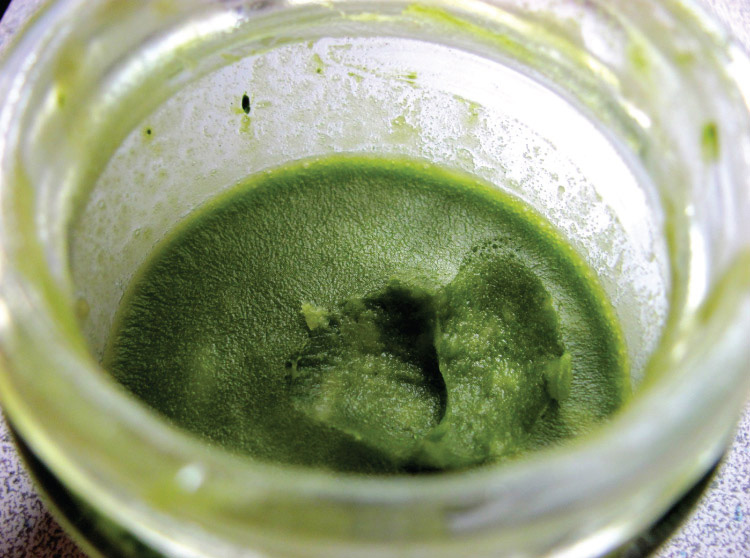 Cho hỗn hợp vào máy xay sinh tố xay nhuyễn, đổ ra bát, trộn với mật ong và baking soda cho đến khi hỗn hợp quyện vào với nhau.