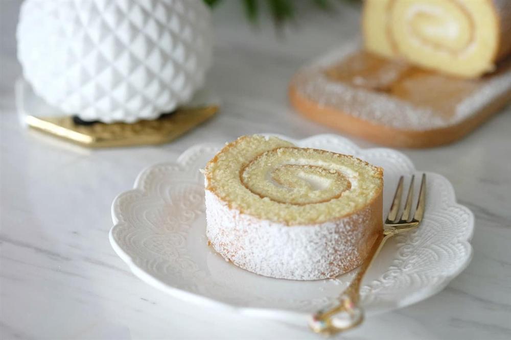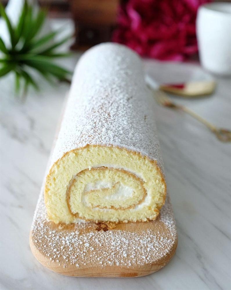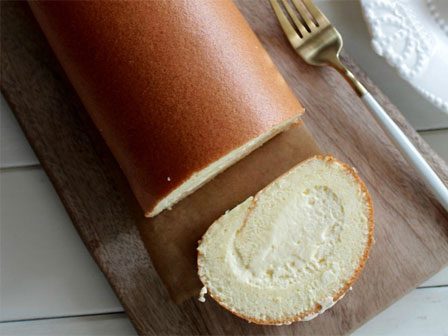 Cho phần nguyên liệu làm kem vào tô, đánh bông cứng. Bánh chín lấy ra ngoài đợi nguội bớt, sau đó cuộn bánh lại để tạo form cho bánh.