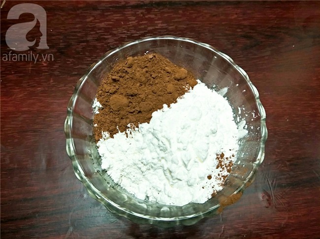 Cho bột mì, bột cacao vào bát trộn đều sau đó rây bột cho mịn, bật lò nướng 160 độ C làm nóng lò.