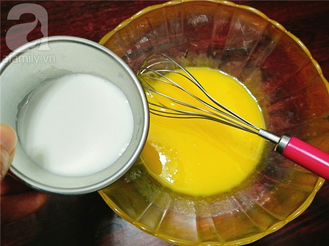 Tách riêng lòng trắng và lòng đỏ ra 2 tô sạch, tô lòng đỏ bạn cho sữa tươi, dầu ăn và khuấy đều bằng phới lồng.