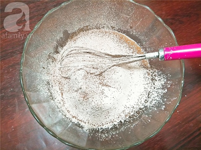 Tiếp đến bạn cho hỗn hợp bột đã rây mịn vào, trộn đều tới khi không còn nhìn thấy bột khô là được, để sang 1 bên.