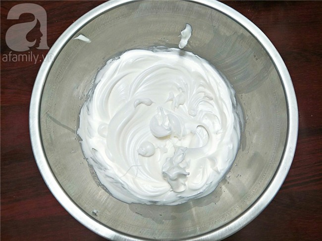 Tô lòng trắng bạn cho 1 xíu muối, nước cốt chanh và dùng máy đánh trứng đánh cho sủi bọt sau đó cho từ từ đường cát vào tô lòng trắng, vừa đánh vừa cho đường, đánh tới khi lòng trắng trứng bông cứng thì dừng lại.