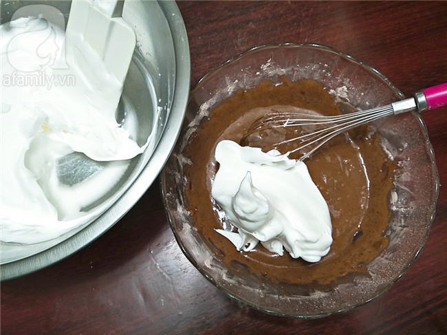 Trút toàn bộ hỗn hợp vừa trộn sang tô lòng trắng và dùng phới dẹt trộn đều tới khi hỗn hợp đồng nhất là được.