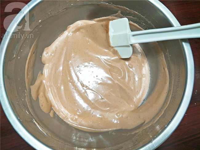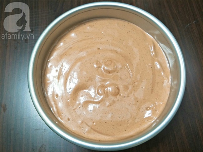 Đổ hỗn hợp bột vào khuôn, cầm khuôn thả xuống bàn 2-3 lần cho vỡ bớt bọt khí to và đem nướng khoảng 50-55 phút là bánh chín.