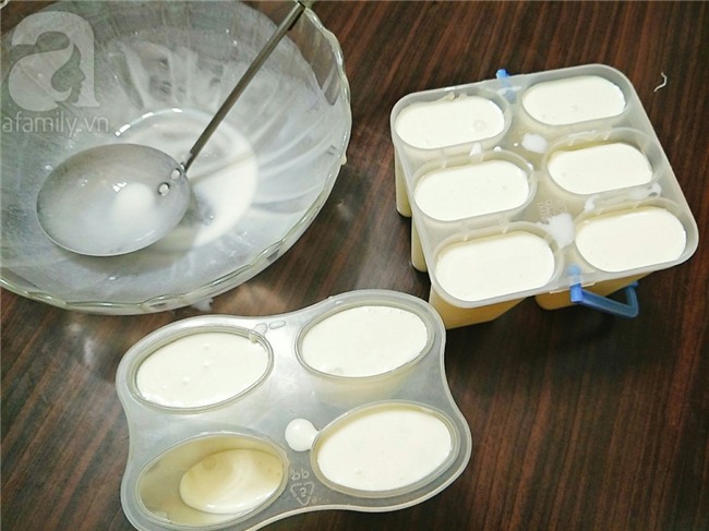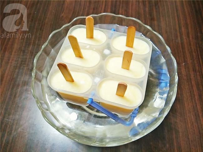 Cho kem vào ngăn đá và để 7-8 tiếng cho kem đông cứng lại, khi ăn lấy khuôn kem ra và ngâm vào tô nước để lấy kem ra dễ dàng hơn.