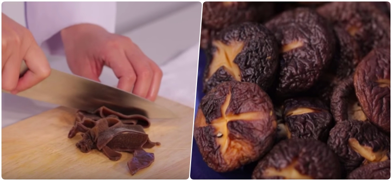 - Bạn ngâm nấm hương và mộc nhĩ với nước ấm trong khoảng 30 phút cho nở rồi rửa sạch. Mộc nhĩ thì thái sợi, nấm hương thì bỏ chân và xẻ hình chữ thập lên mặt cho đẹp. Lưu ý đừng thái sợi quá nhỏ nấm sẽ vụn mất đi độ giòn ngon.