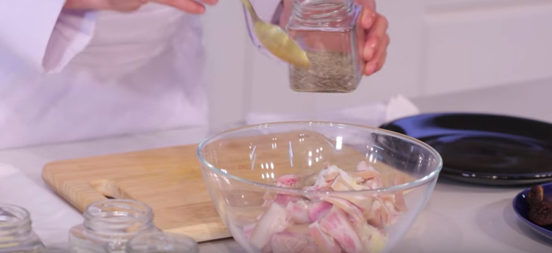 - Cho thịt vào tô rồi ướp với 1 muỗng canh đường, 1 muỗng canh hạt nêm, 1 muỗng cà phê bột ngọt, 1/2 muỗng cà phê muối, 1 muỗng cà phê tiêu, trộn đều và ướp khoảng 30 phút.