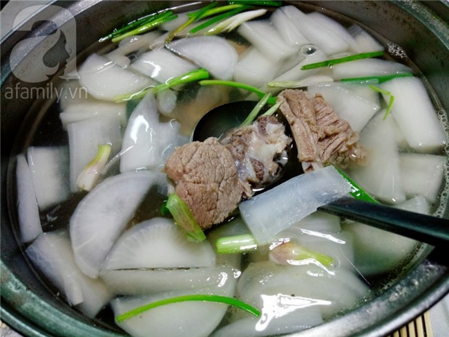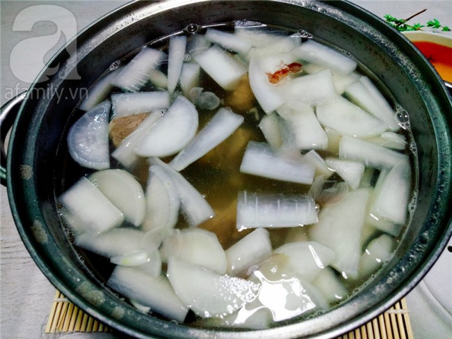 Khi xương mềm, củ cải chín nhừ, nước dùng trong veo thì nêm nếm lại gia vị cho vừa ăn, cho thêm tiêu và hành lá vào (tùy thích).