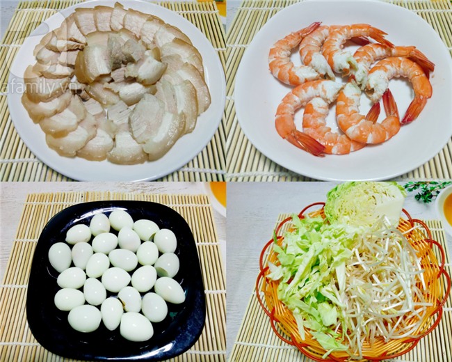 Thịt ba chỉ thái lát mỏng. Tôm luộc chín, bóc vỏ, bỏ phần chỉ đen dọc thân tôm. Trứng cút luộc chín, bóc vỏ. Bắp cải thái sợi nhỏ.