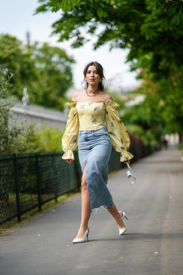 Một chiếc áo trễ vai màu trắng tối giản trông đặc biệt nổi bật khi kết hợp với váy midi màu sắc bắt mắt, họa tiết kẻ sọc hoặc in hình dễ thương.