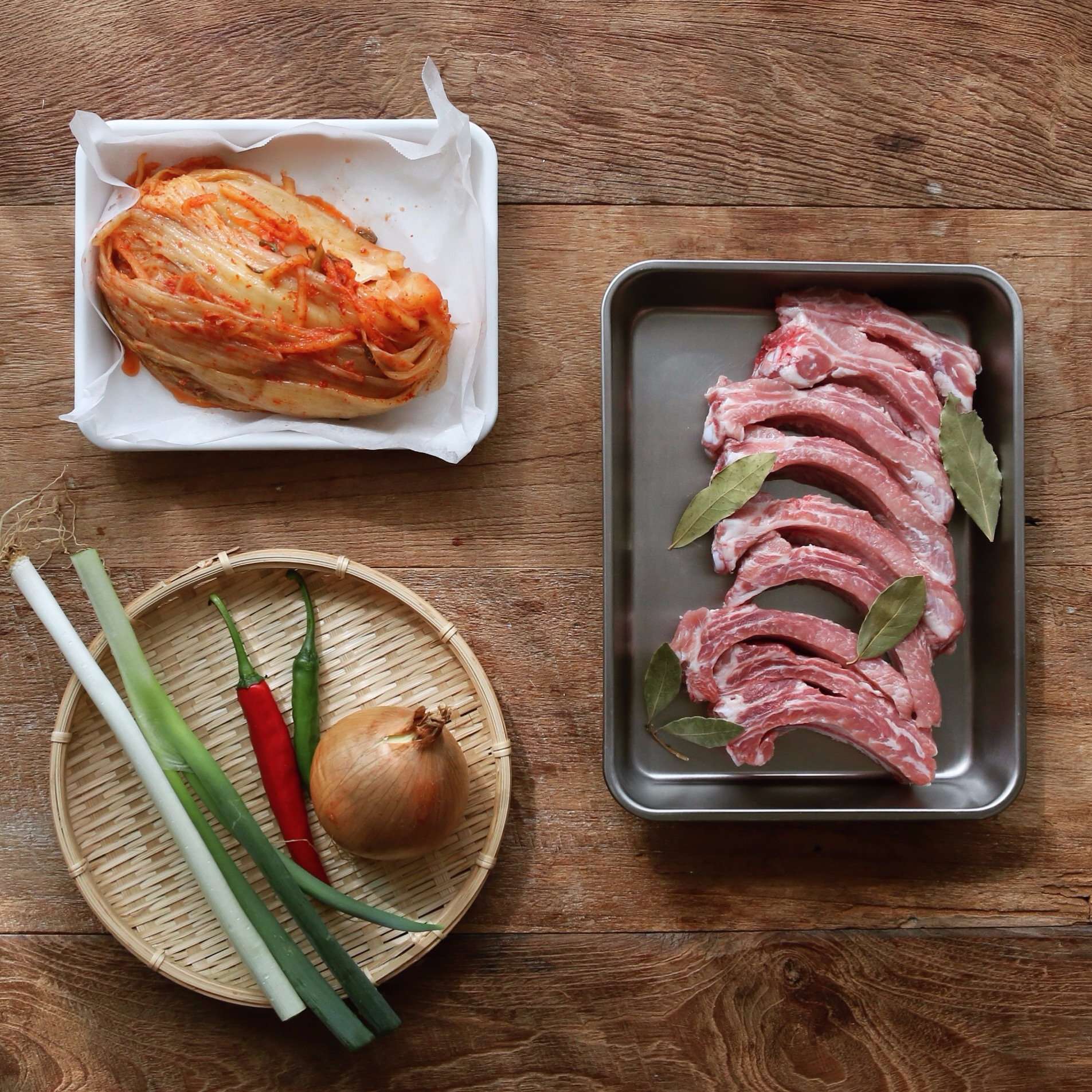Cho kim chi, sườn, 750ml nước dùng và các gia vị vào một nồi sạch. Đun với lửa vừa trong 20 phút.
