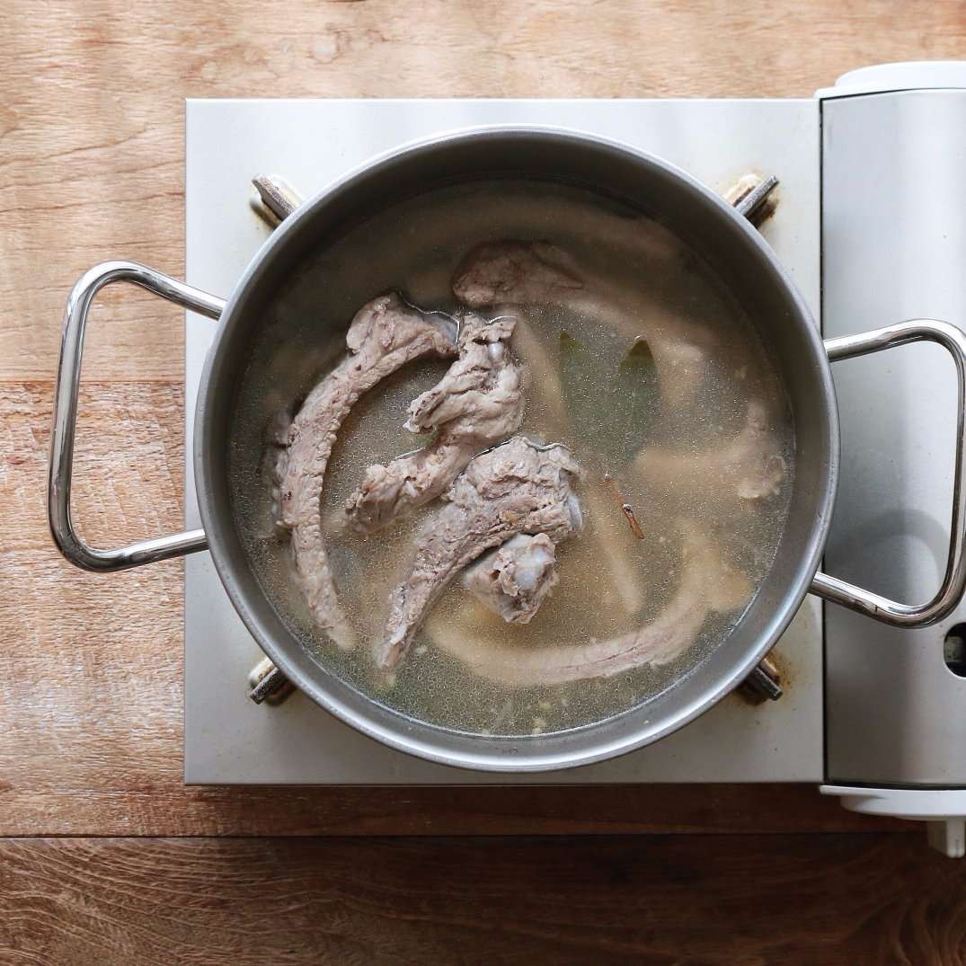 Chặt sườn vừa ăn rồi ngâm sườn trong nước 30 phút để loại bỏ tạp chất. Cho thịt và các nguyên liệu phần nước hầm xương vào nồi, nấu trong 30 phút. Sau đó vớt sườn ra.