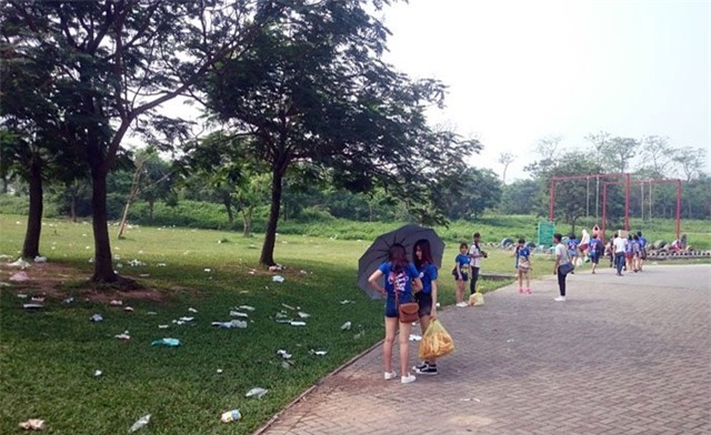 Ngày 3.5, ngày cuối cùng của kỳ nghỉ lễ 30.4 và 1.5, lượng người đổ về các công viên, khu vui chơi đã thưa dần. Tại Công viên Yên Sở (Hà Nội), một trong những công viên đô thị lớn nhất Việt Nam, rác thải từ những chuyến dã ngoại của người dân vương vãi khắp nơi.