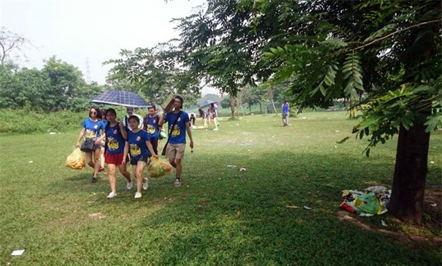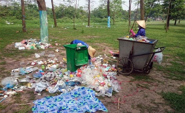 Công nhân vệ sinh phải gom từng mảnh rác trên bãi cỏ.