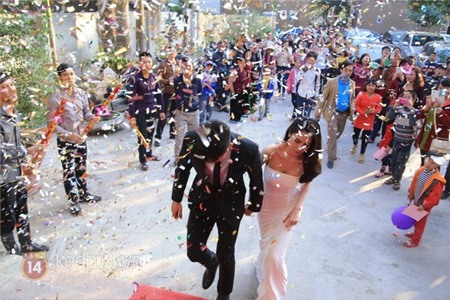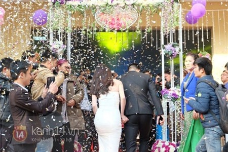 Cô dâu chú rể được chào đón với màn bắn hoa giấy tưng bừng |