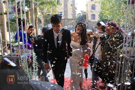 16h00: Công Vinh nắm chặt tay cô dâu Thủy Tiên tiến vào nhà hàng tổ chức tiệc cưới.