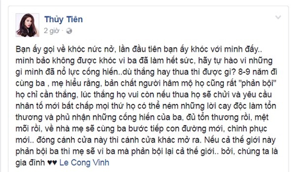 Đó là những chia sẻ đầy xúc động, và là sự an ủi rất đúng lúc của Thủy Tiên gửi tới Công Vinh. Ngay sau đó, Công Vinh cũng cập nhật một dòng trạng thái lên trang cá nhân. Anh không quên cảm ơn tất cả những người hâm mộ đã luôn ủng hộ mình trước giờ phút giã từ sự nghiệp.