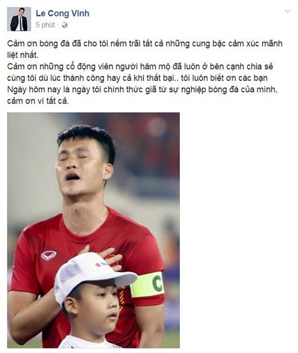 Nguyên văn chia sẻ của Công Vinh: "Cảm ơn bóng đá đã cho tôi nếm trải tất cả những cung bậc cảm xúc mãnh liệt nhất. Cảm ơn những cổ động viên người hâm mộ đã luôn ở bên cạnh chia sẻ cùng tôi dù lúc thành công hay cả khi thất bại. Tôi luôn biết ơn các bạn. Ngày hôm nay là ngày tôi chính thức giã từ sự nghiệp bóng đá của mình, cảm ơn vì tất cả".