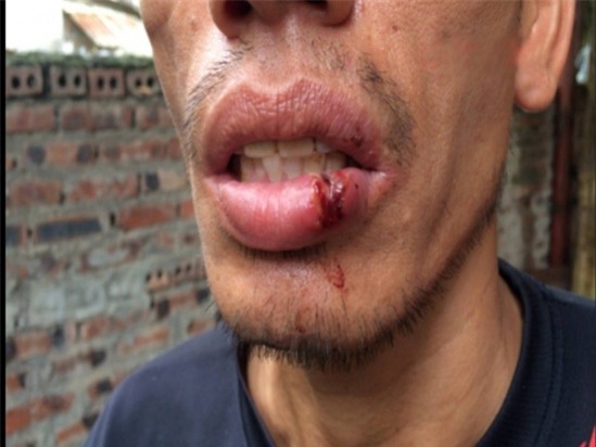 Tài xế Phạm Văn Quảng bị đánh rách môi. Ảnh: Báo Giao thông. |