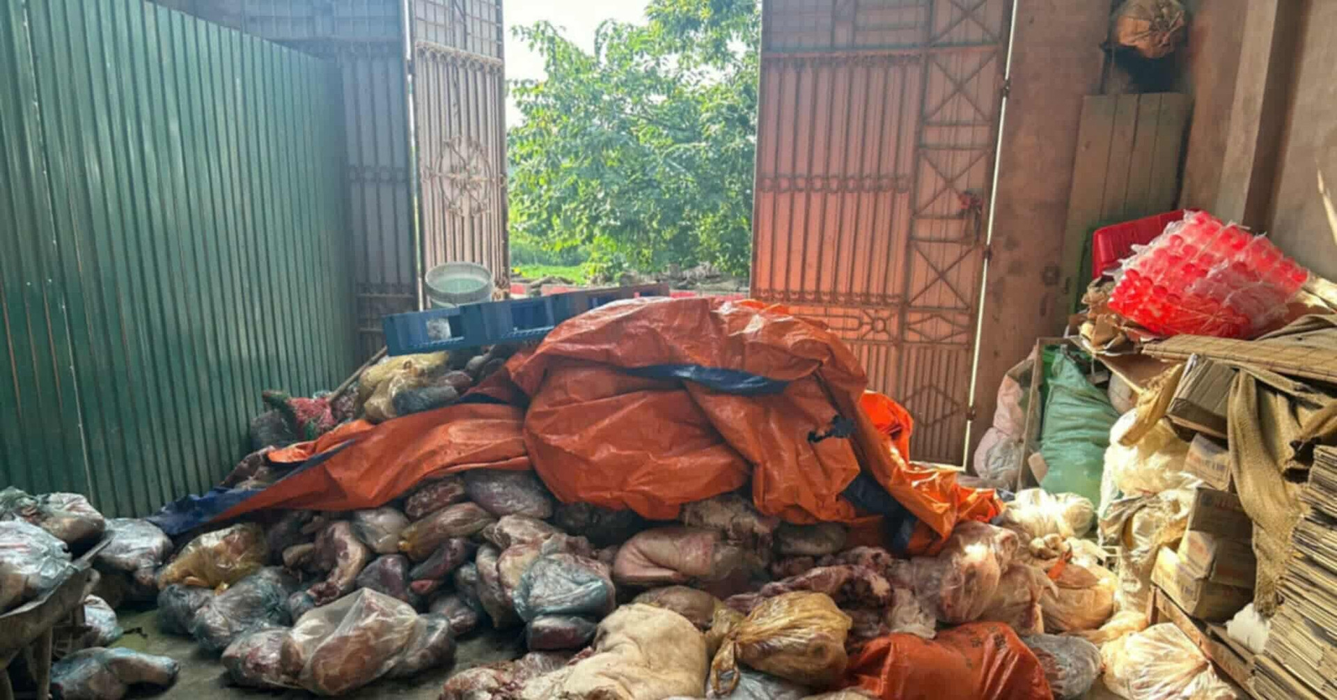 Bên trong thùng xe, lực lượng chức năng phát hiện nhiều bao tải chứa tổng cộng hơn 2 tấn da heo đã đổi màu, bốc mùi nồng nặc.