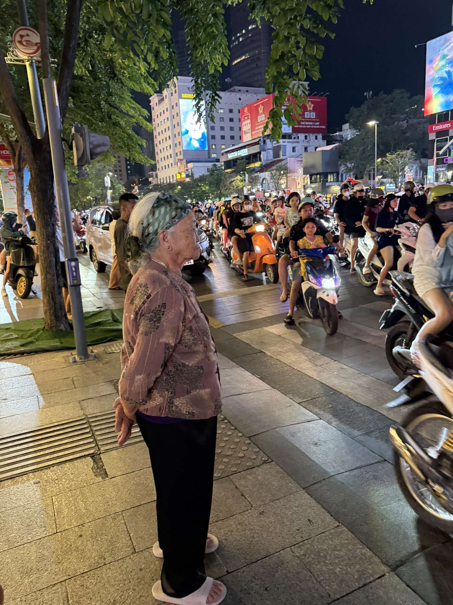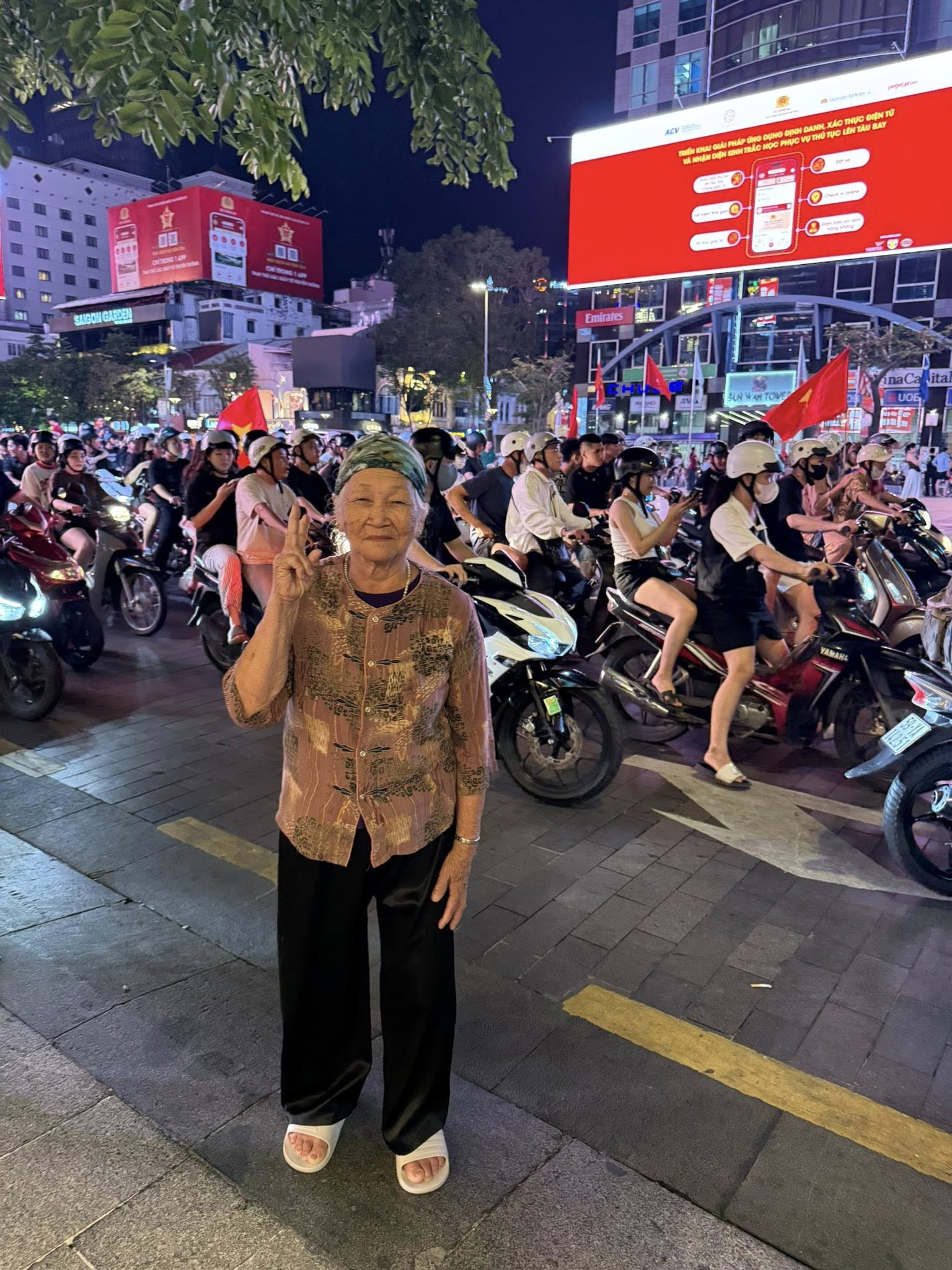 Cụ bà Đỗ Thị Sen (SN 1934, ở Hải Phòng) cũng không giấu nổi sự phấn khởi. Dù đang cùng con cháu đi du lịch tại TPHCM nhưng cụ vẫn hào hứng, xuống đường “đi bão” ăn mừng kết quả thi đấu ấn tượng của đội tuyển U23 Việt Nam.