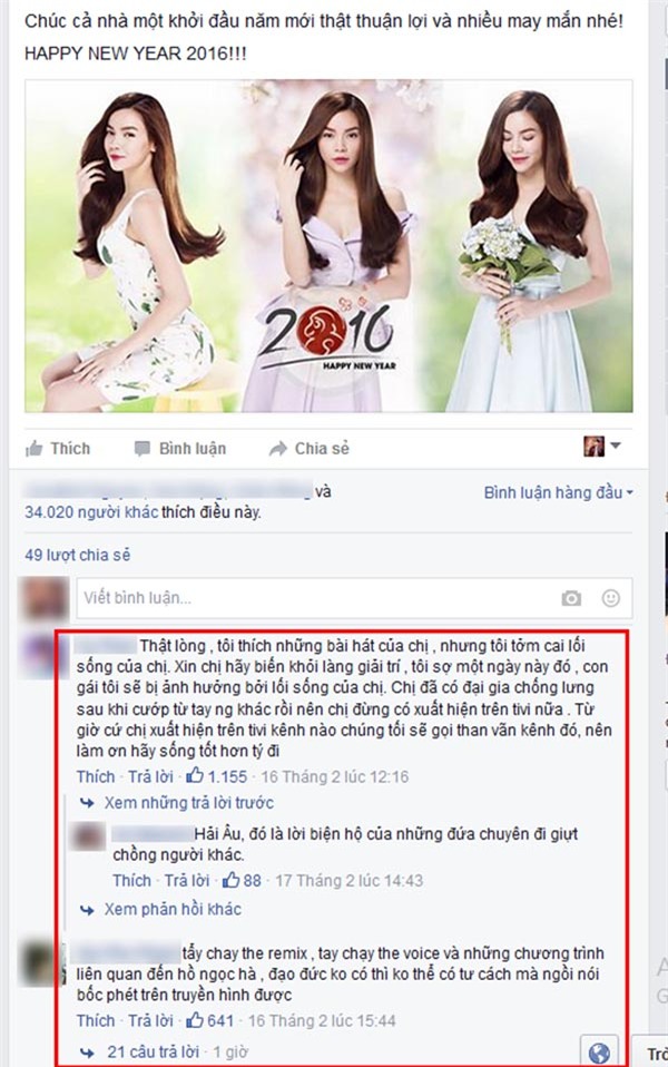 “Hôm nay đọc được bài viết của vợ ông đại gia kia, nhìn người ta chụp ảnh đăng lên chỉ có 3 mẹ con mình bắt đầu đọc lại bài báo về chuyện này, không thể chấp nhận được, bà này đẹp có tài mà tiền cũng không thiếu sao không lựa chọn cho mình một gia đình đúng nghĩa, mà cứ cặp kè với cha của 3 đứa con trong khi chưa làm thủ tục ly hôn. Chính thức ghét bà HNH này, là phụ nữ với nhau cũng từng sinh con mà làm vậy thì từ trước giờ bà nói đạo đức này nọ chỉ là giả tạo, giờ mới biết sao nhiều người chửi thế…”.