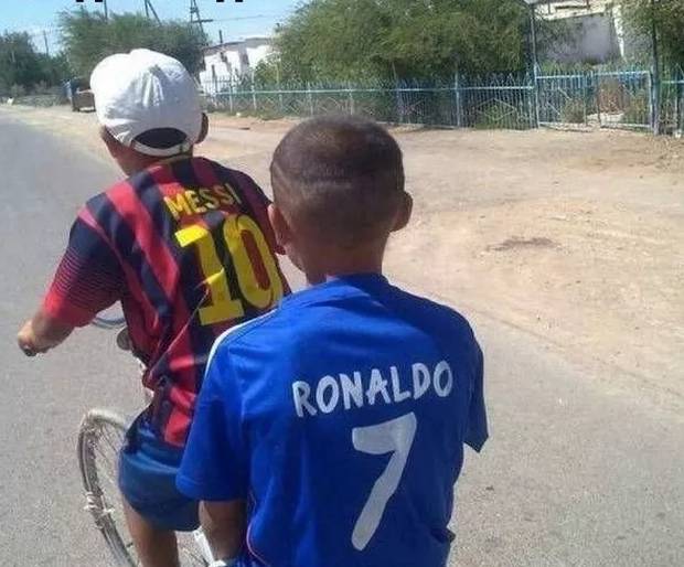 Messi chở Ronaldo trên chiếc xe đạp cà tàng.