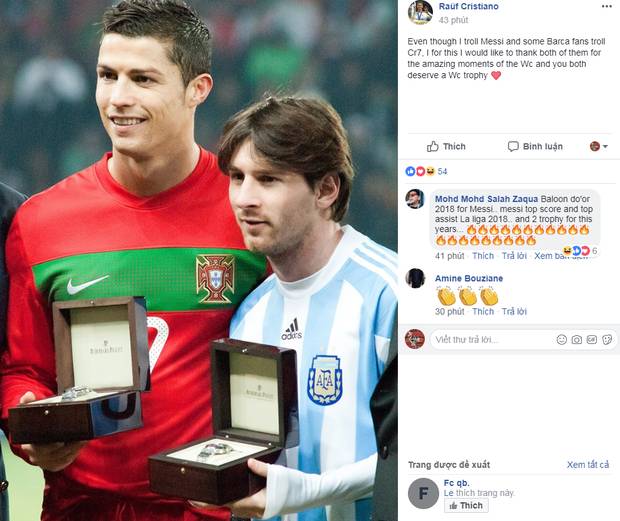 NHM Rauf Cristiano thì cảm thông với cả hai ngôi sao: "Mặc dù tôi troll Messi cũng giống như cái cách mà các fan Barca troll CR7. Nhưng tôi thực sự muốn cảm ơn cả hai về những khoảnh khắc mà họ đã làm tại World Cup 2018, họ thực sự xứng đáng có được một lần chạm tay vào chiếp Cúp vàng thế giới."
