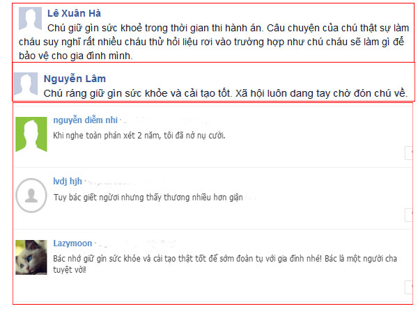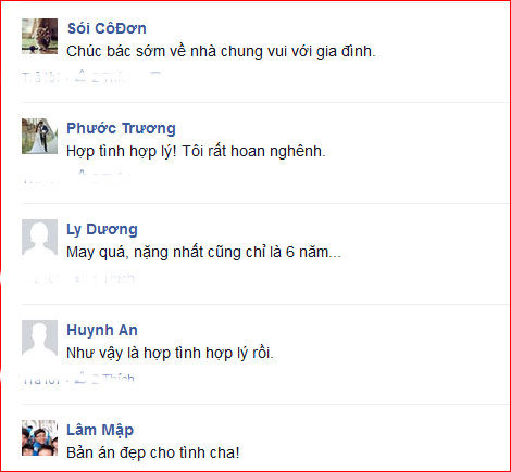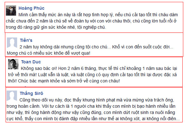 Độc giả Hoàng Phúc viết: “Mình cảm thấy mức án này là rất hợp tình hợp lý, nếu chú cải tạo tốt thì cháu dám chắc chưa đến 2 năm là chú sẽ về đoàn tụ với con với cháu thôi, chú cũng lớn tuổi rồi ở trong đó ráng giữ gìn sức khỏe nhé, tội nghiệp chú.”