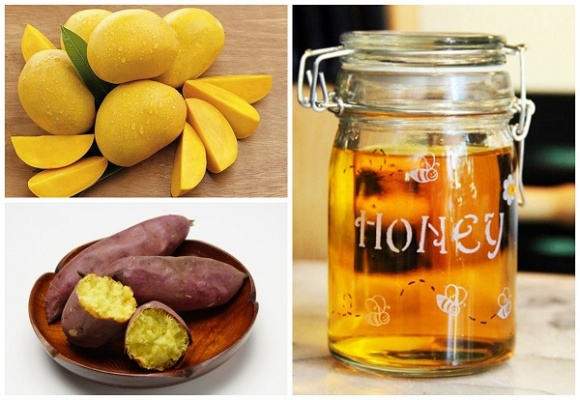 - Mật ong và xoài chống lại các gốc tự do gây hại cho nếp nhăn và lão hóa sớm và khoai lang có đặc tính kháng viêm.