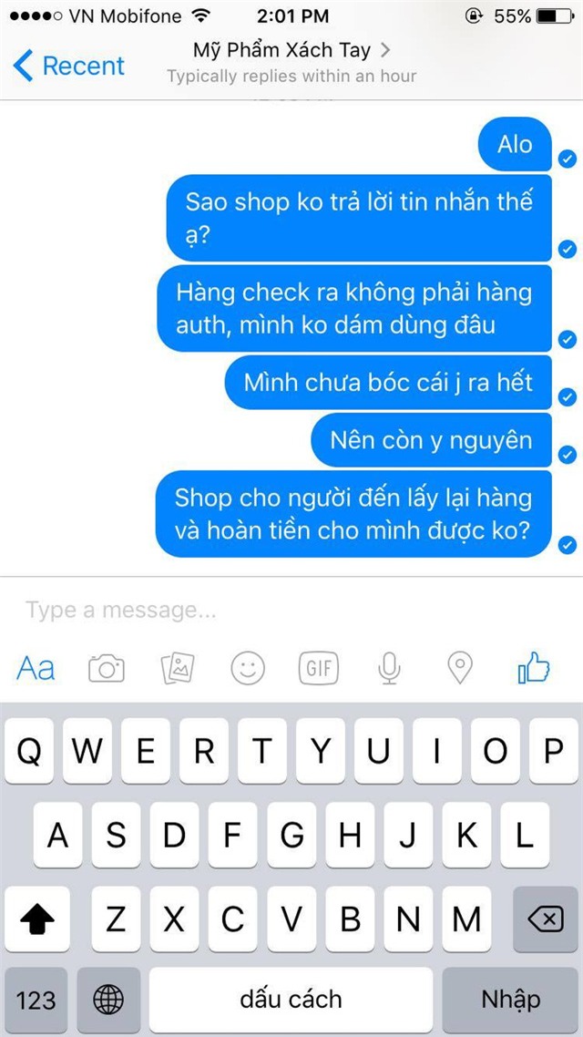 Sau khi nhận được những dòng tin nhắn phản hồi từ phía khách hàng V.A.K thì phía cửa hàng không có bất kỳ phản hồi nào. Bên cạnh đó, V.A.K cũng thông báo rằng, hiện tại phía cửa hàng đã chặn facebook của cô để tránh bị làm phiền.