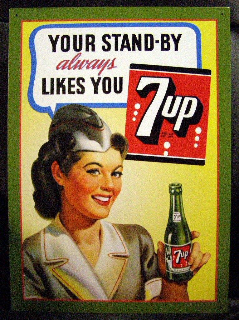Nhãn hiệu những năm 1930 của 7-Up (trái) nhấn mạnh thành phần Lithium, trong khi đó poster năm 1995 nhấn mạnh sản phẩm tự nhiên và an toàn với cả trẻ em. Thực ra từ năm 1948, 7-Up đã có hướng đi mới