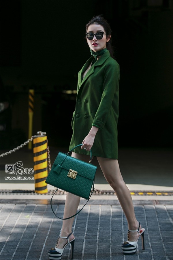 vest tông xanh lục. Cô chọn mốt vest giấu quần thời thượng, kết hợp