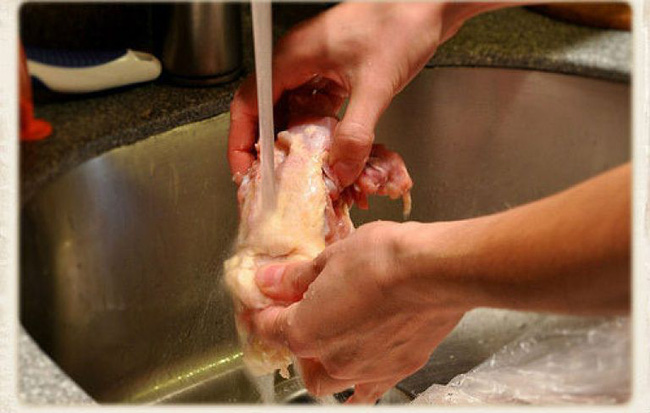 Rửa thịt dưới vòi nước như rửa rau, các bà nội trợ mong rằng vi khuẩn và các chất độc hại sẽ bị nước rửa trôi nhưng cách làm này cũng không mang lại hiệu quả mà chỉ khiến nước có dính chất bẩn và vi khẩn bắn ra quanh bếp tiềm ẩn nguy cơ bệnh tật cho mọi người.