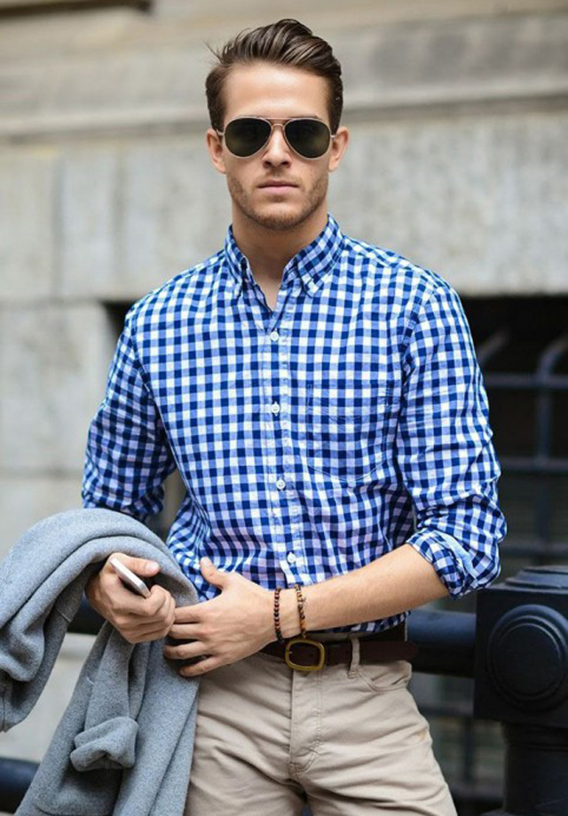 Một chiếc sơ mi caro màu xanh nhã nhặn là vô cùng thích hợp để chàng diện ngay trong những ngày xuân ấm áp.
