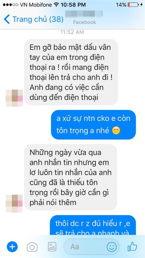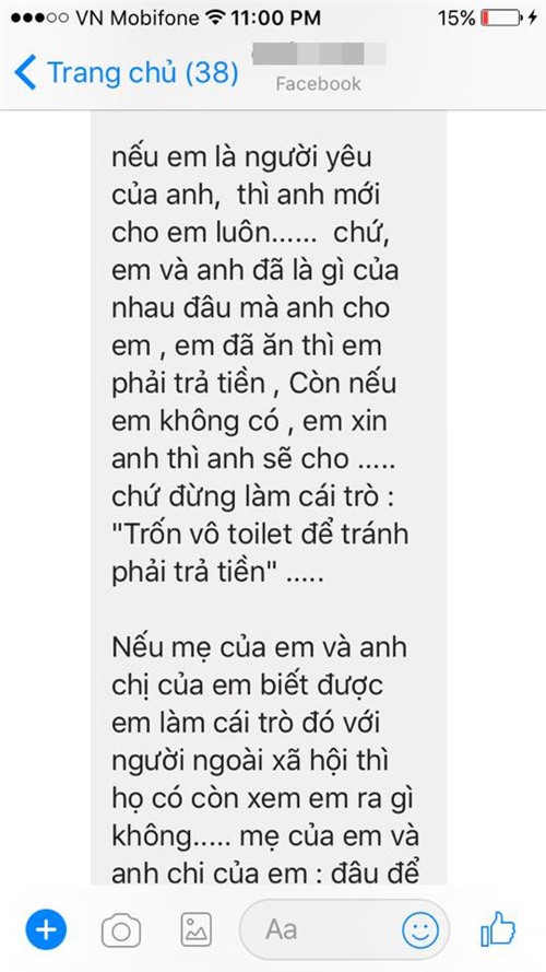 Theo dõi cả đoạn tin nhắn thì thấy chủ yếu là chàng trai nói, còn cô gái đáp lại rất ngắn gọn. Anh chàng liên tục trách cô gái ham tiền người khác, lại không có tiền, nếu có thì cũng không cần phải trốn đi toilet mỗi lần thanh toán nên đừng mạnh miệng.