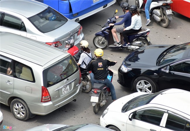 Xe máy luồn lách giữa làn ôtô. |