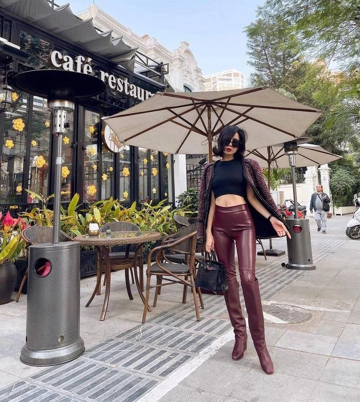 Combo yêu thích của Lệ Quyên là mix quần da với boots, chắc chắn không thể thiếu túi hiệu bạc tỷ để gia tăng độ "chanh sả".