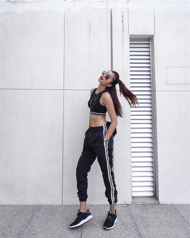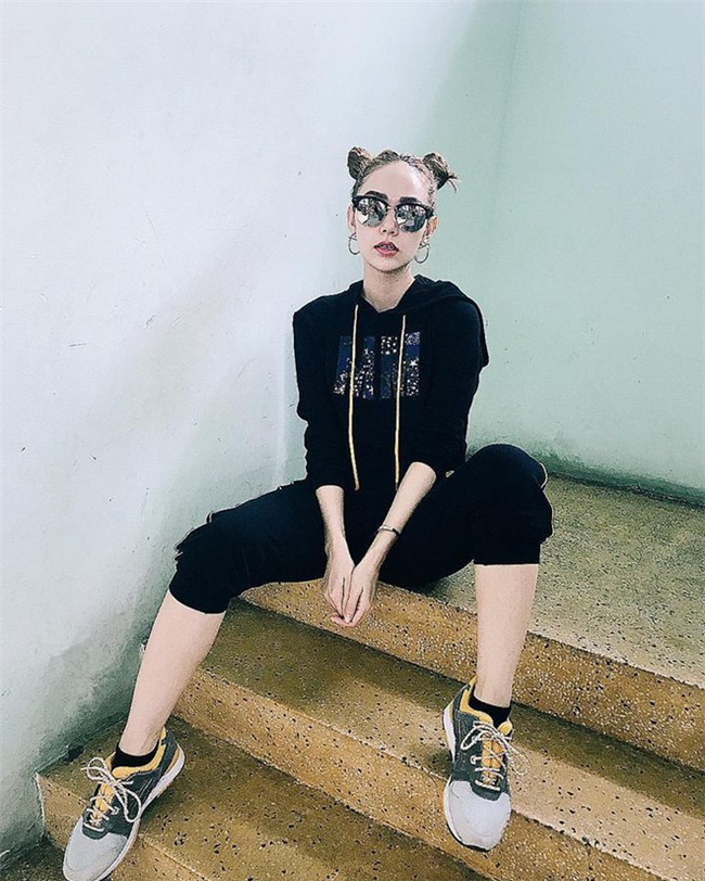 Minh Hằng nổi loạn, tinh nghịch với mộ set đồ thể thao, cô nàng còn chọn kiểu tóc búi hai bên khá hay ho để nhấn thêm cho street style tuần này của mình.