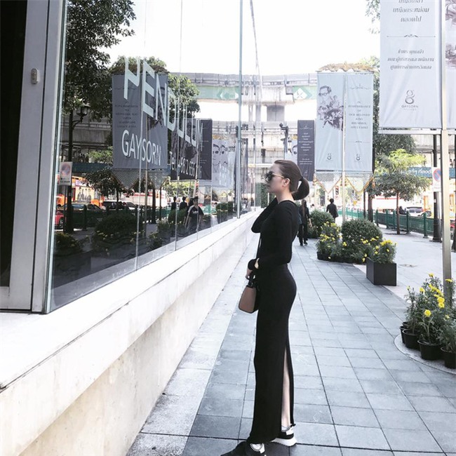 Hà Hồ cũng chọn style tương đồng với Kỳ Duyên nhưng thay vì diện cả cây đen, người đẹp chọn áo phông họa tiết Gucci và một đôi sneaker đen đơn giản. Tuy nhiên trông Hà Hồ lại gầy hơn hẳn mọi khi, tay có phần gân guốc, gương mặt cũng xương hơn khi cười.