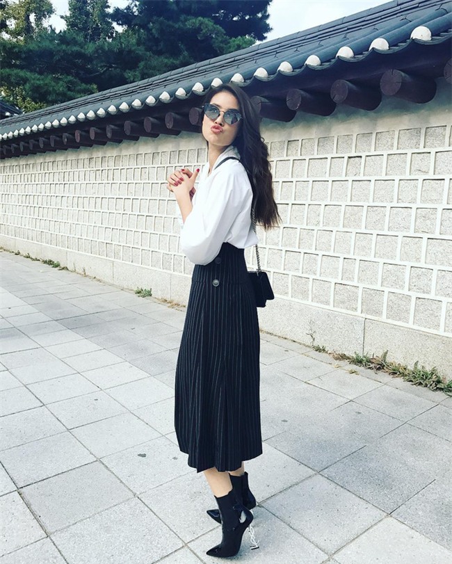 Một set đồ khác của Phạm Hương lại bao trùm hai tông đen - trắng kinh điển. Diện sơmi trắng cùng chân váy midi kẻ sọc, Phạm Hương chọn thêm đôi boots da hiệu YSL với phần đế cách điệu ấn tượng.