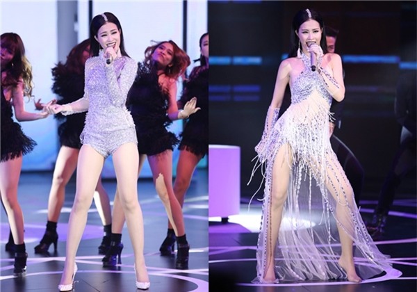 Dù không sở hữu chiều cao “khủng” nhưng Đông Nhi vẫn tỏa sáng không hề kém cạnh dàn mẫu trong Đêm hội Chân dài 10. Nữ ca sĩ phô diễn khéo léo hình thể thon gọn, eo thắt trong thiết kế bodysuit ánh kim của Lê Thanh Hòa. Hai mẫu trang phục sử dụng nhiều chi tiết đang là xu hướng hiện nay như: tua rua, đinh tán,…