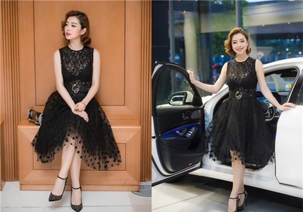 Sử dụng sắc đen trầm mặc, Jennifer Phạm vừa điệu đà với dáng váy xòe cổ điển nhưng không kém phần gợi cảm với chất liệu ren xuyên thấu mỏng tang. Phụ kiện đi kèm đều được chọn phối đồng điệu với trang phục của bà mẹ hai con.