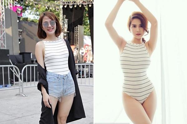 Và không nằm ngoài guồng quay của xu hướng đình đám này, Minh Hằng và Ngọc Trinh cũng bất ngờ khoe sắc với bodysuit. Nhưng không hẹn mà gặp, hai chân dài lại cùng chung ý tưởng diện giống hệt nhau một item, nhưng trong khi Ngọc Trinh khoe sắc ở nhà thì Minh Hằng lại táo bạo khi mang luôn xuống phố.