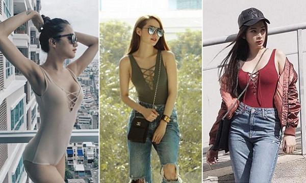 Minh Hằng có vẻ như là một trong những người đẹp mê diện bodysuit ra phố nhất. Cô tiếp tục đụng hàng với Hoa hậu Hương Giang, Angela Phương Trinh.