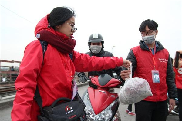 Tổng cộng có hơn 100 tình nguyện viên chia thành 8 điểm đứng dọc trên cầu để tuyên truyền, giúp người dân thả cá, đồ hoá vàng.