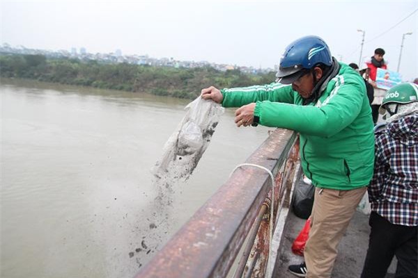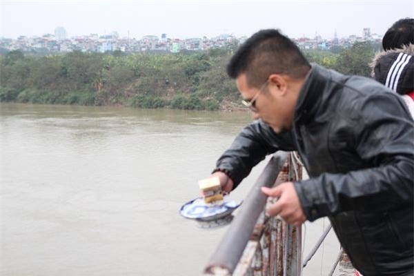Tại cầu Long Biên, một số người đến thả cá, ném bàn thờ, bát hương xuống sông. Các bạn tình nguyên viên đến để hướng dẫn người dần thả cá và tro hoá vàng đúng cách, không ảnh hưởng đến môi trường.