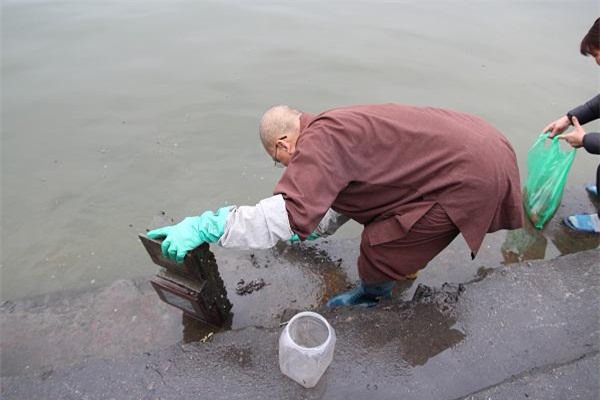 Tại hồ Tây, một nhà sư đi thu gom ban thờ người dân ném xuống sông.